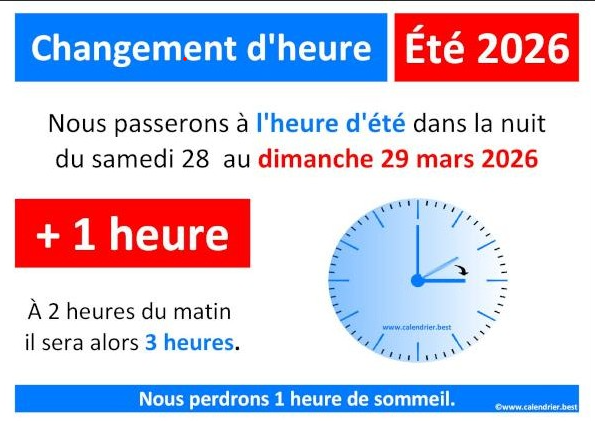 Dans la nuit du samedi 28 mars 2026 au dimanche 29 mars 2026 nous passons à l’heure d’été